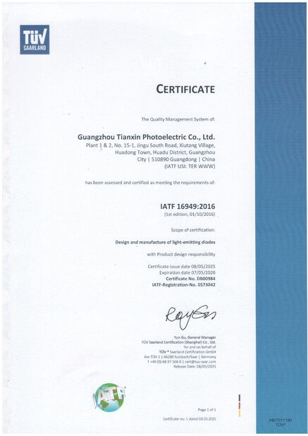 Establised in Aug.2004, Guangzhou Tyanshine Photelectic is a integrated High-tech LED Package manufacturer which includes R&D,production,sales and trade.It have been moved into its self-invested new industrial zone located at Huadu District in January of 2017.The company possess multi full-automatic productions lines with imported machines and equipments, strict management system and has a excellent R&D team and managent personnels.